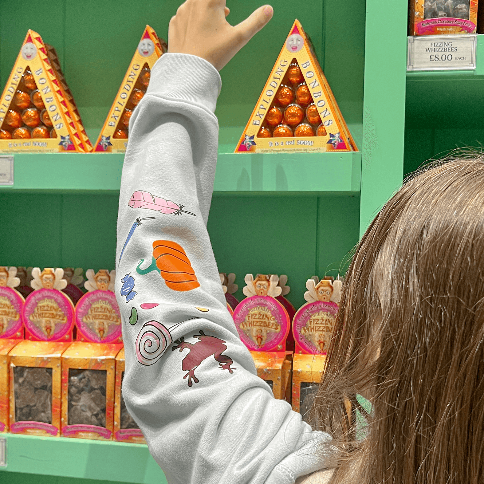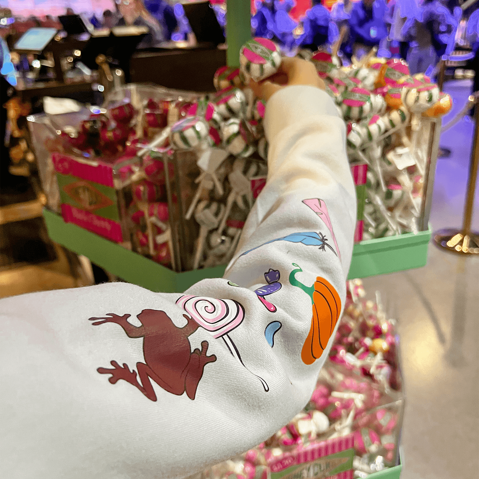 Con caramelle, zucche e cioccorane che spuntano tra le maniche, questa felpa non è solo cozy: è un level-up di dolcezza e magia.