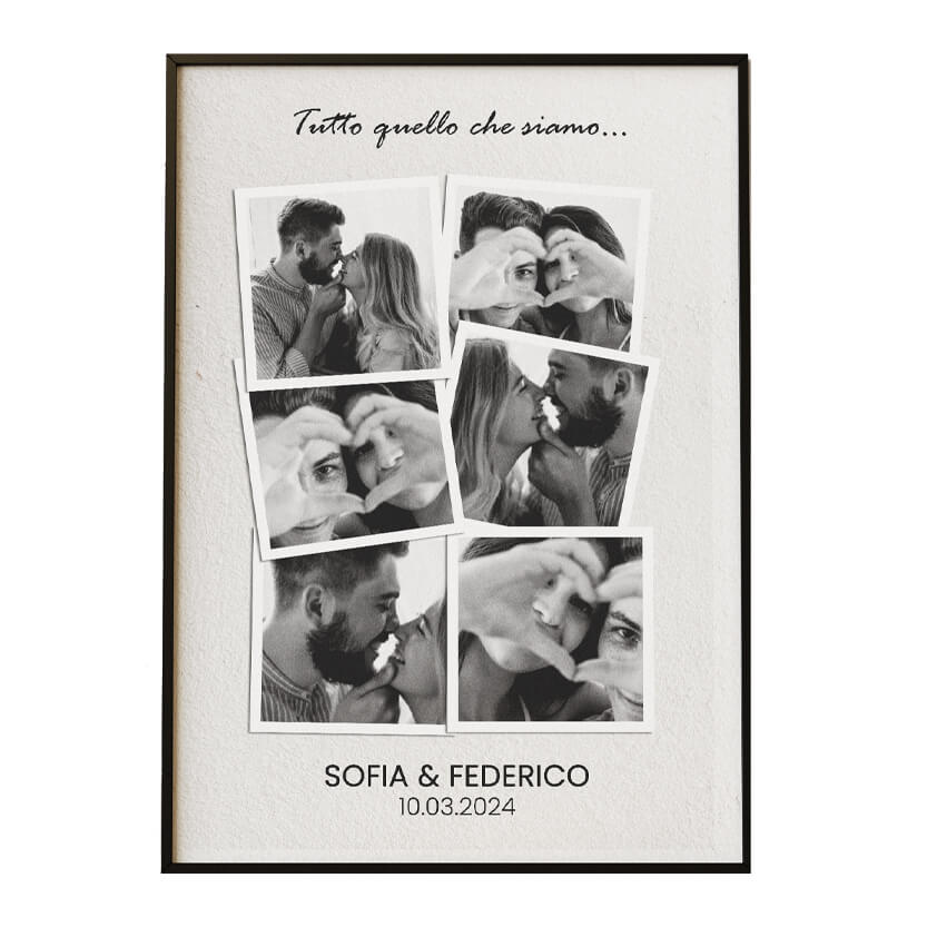 Puoi inviarci fino a 2 foto (impaginate in modo creativo, per dare l’effetto di un ricordo ancora più ricco) e aggiungere un testo a tua scelta: una frase, una data, un nome, una dedica speciale.