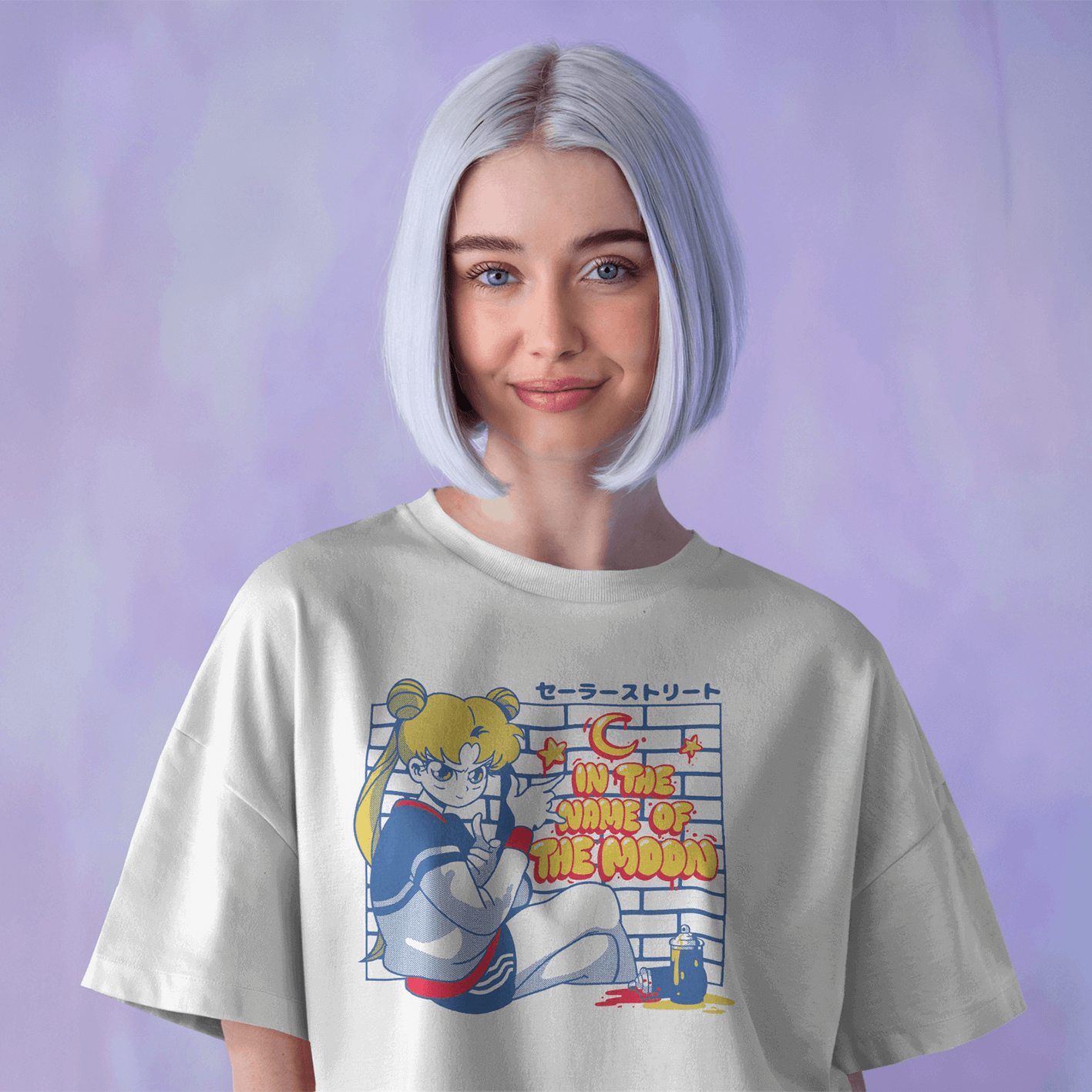 Questa maglietta bianca unisex è un omaggio alla magia notturna di Sailor Moon, ma rivisitata in chiave streetwear: linee decise, vibe urban e dettagli che fanno battere il cuore di ogni fan.