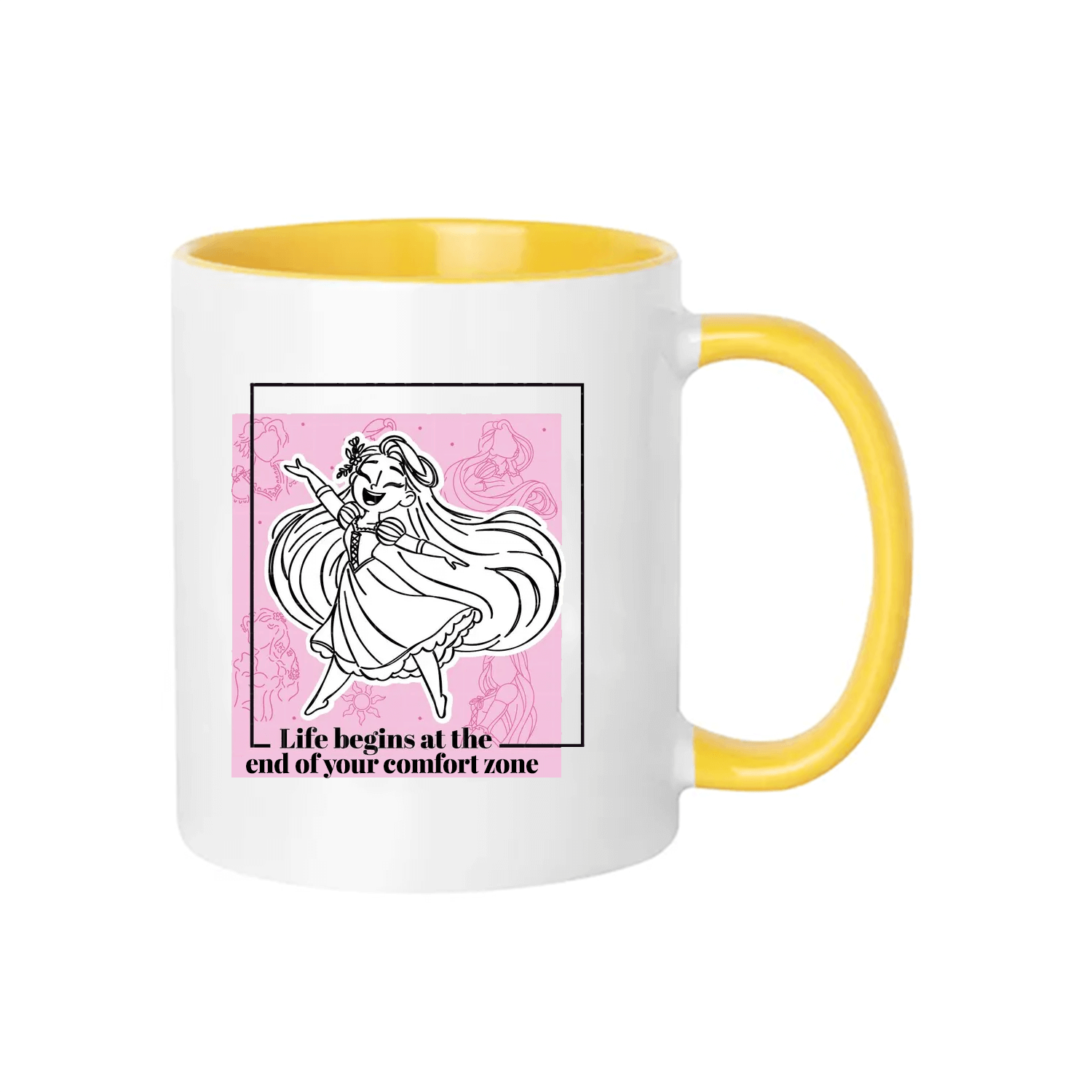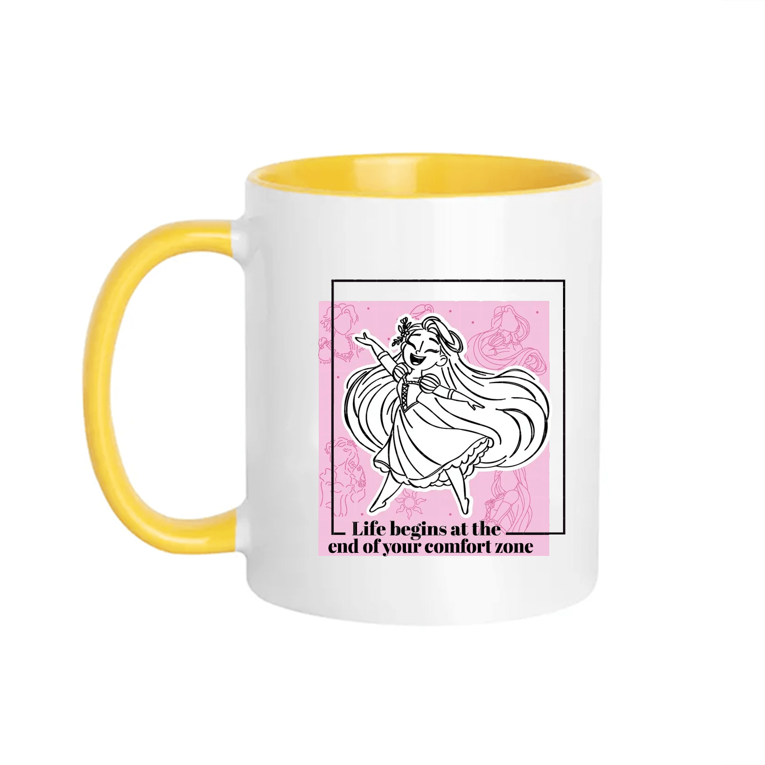 Con i suoi dettagli giallo sole, il disegno ispirato a una principessa libera e ribelle, e una frase che parla dritta al cuore, questa tazza è perfetta per le mattine in cui serve una spinta. O un salto nel vuoto. Ma fatto con stile.